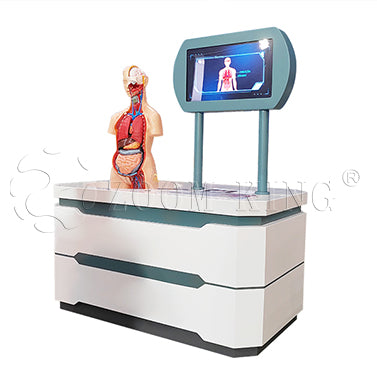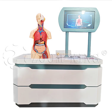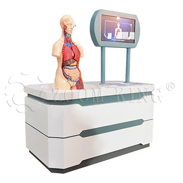 elements. The first is a table holding a human mannequin with models of the major organs: lungs,